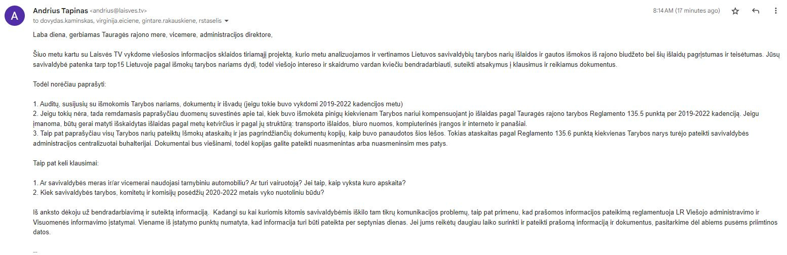 Balandžio 25 dieną Tauragės savivaldybės vadovams išsiųstas pirmasis prašymas suteikti informaciją ir dokumentus